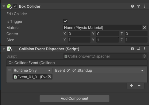イベントごとにそれぞれ別な処理を都度作るのはめんどいので、検出したコライダーを別GameObjectに通知する汎用スクリプトを書いた。